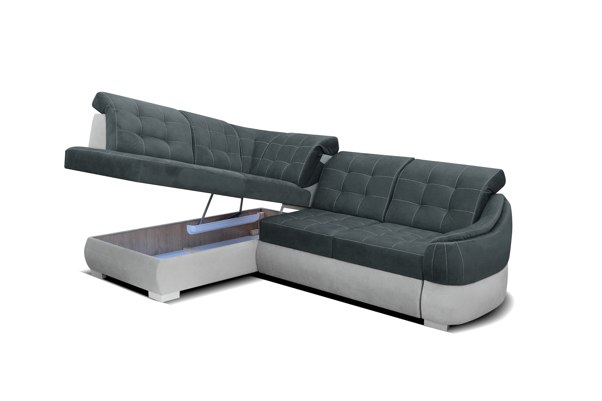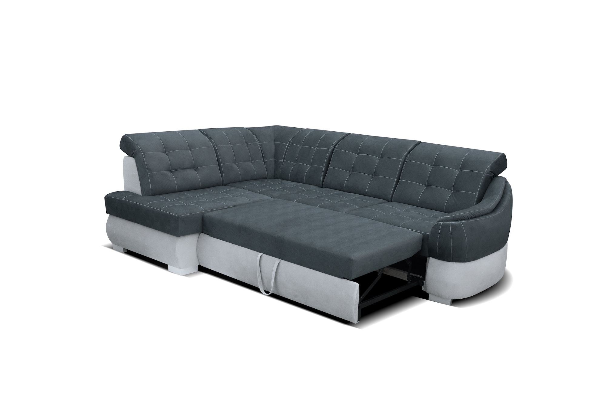 Kluczowym elementem narożnika są regulowane zagłówki, które umożliwiają wygodne podparcie szyi i głowy, a tym samym pozwalają przyjąć najbardziej komfortową pozycję. Dodatkowo model wyposażono w 2 funkcje RELAX – wysuwane fragmenty oparcia, które zwiększają ergonomię i pozwalają dopasować głębokość siedzenia do indywidualnych preferencji użytkownika. Po rozłożeniu narożnik oferuje przestronną powierzchnię spania, wspieraną przez sprężyny faliste i piankę wysokoelastyczną, co zapewnia wygodę zarówno dla gości, jak i podczas okazjonalnego codziennego snu.