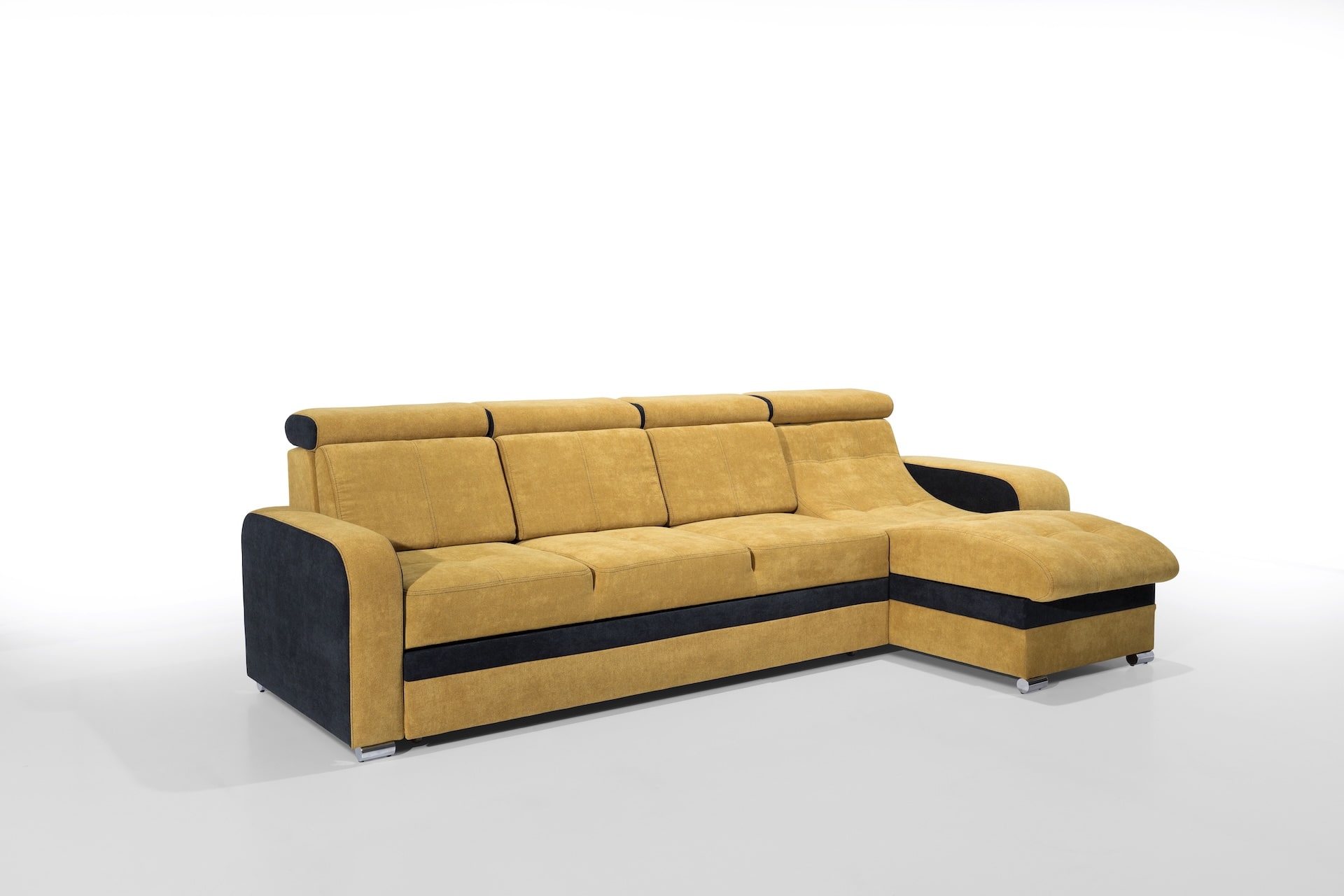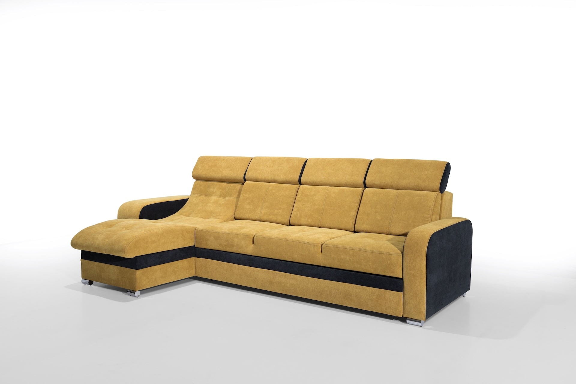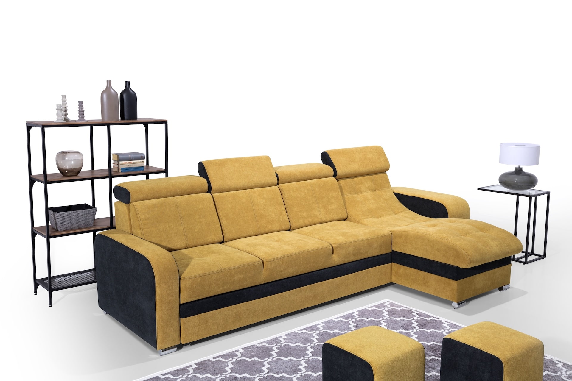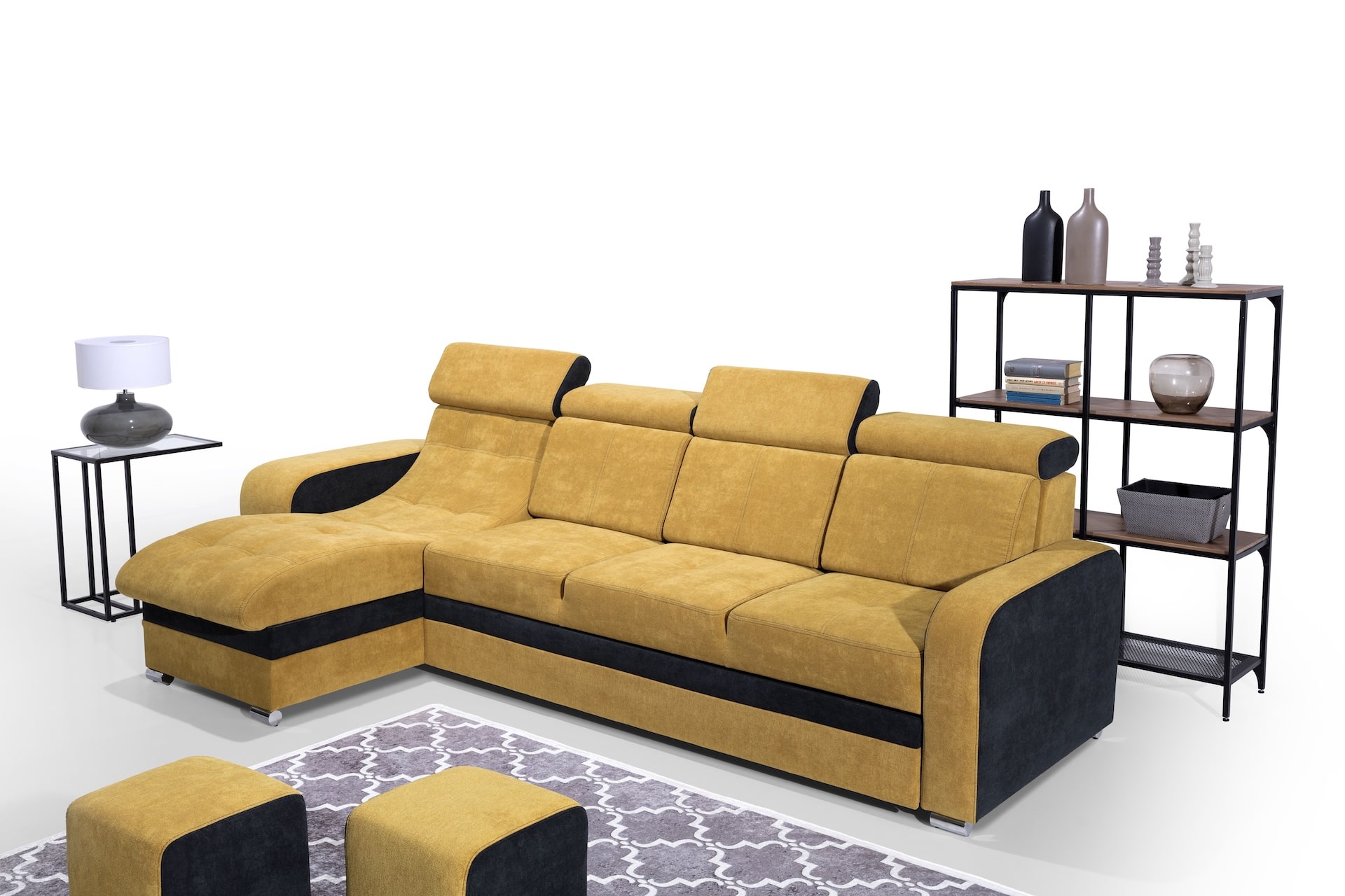 Model został wyposażony w 4 regulowane zagłówki, które umożliwiają indywidualne dopasowanie wysokości oparcia. W zestawie znajdują się również 2 praktyczne pufy, które świetnie sprawdzą się jako dodatkowe siedziska, podnóżki lub element dekoracyjny. Zdejmowane poduchy oparciowe z pianki zapewniają miękkość i komfort podczas użytkowania, a pojemnik na pościel pozwala utrzymać porządek w salonie. Dzięki funkcji rozkładania opartej na mechanizmie DELFIN narożnik szybko zamienia się w wygodną przestrzeń do spania.