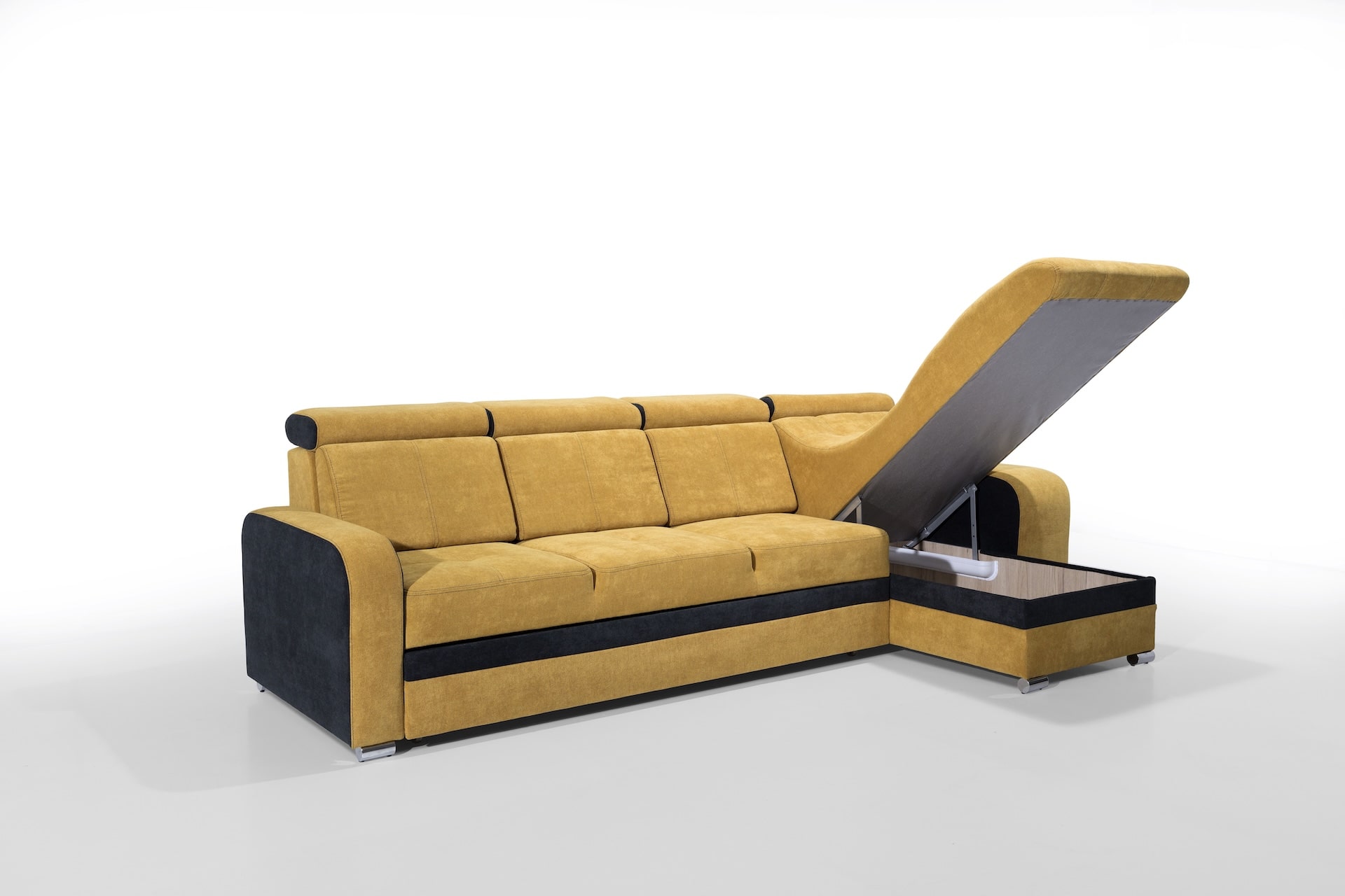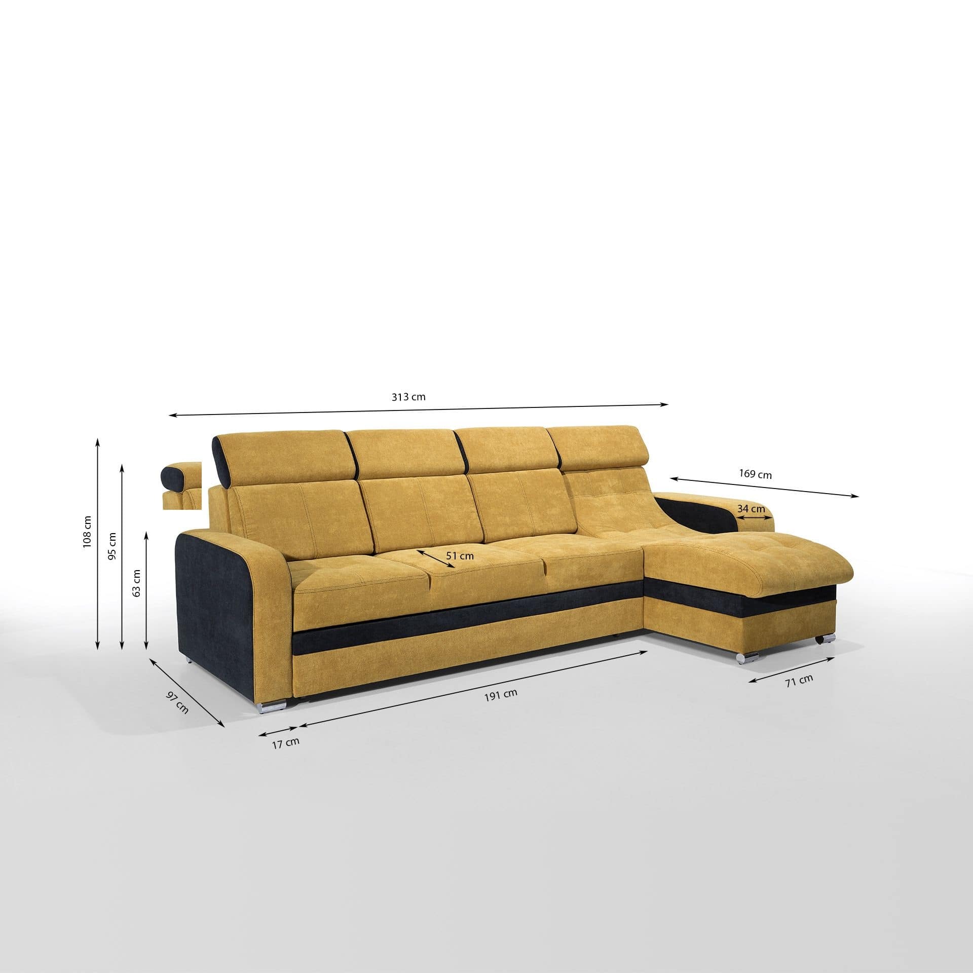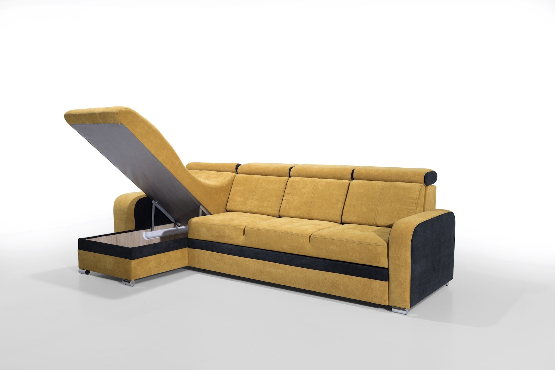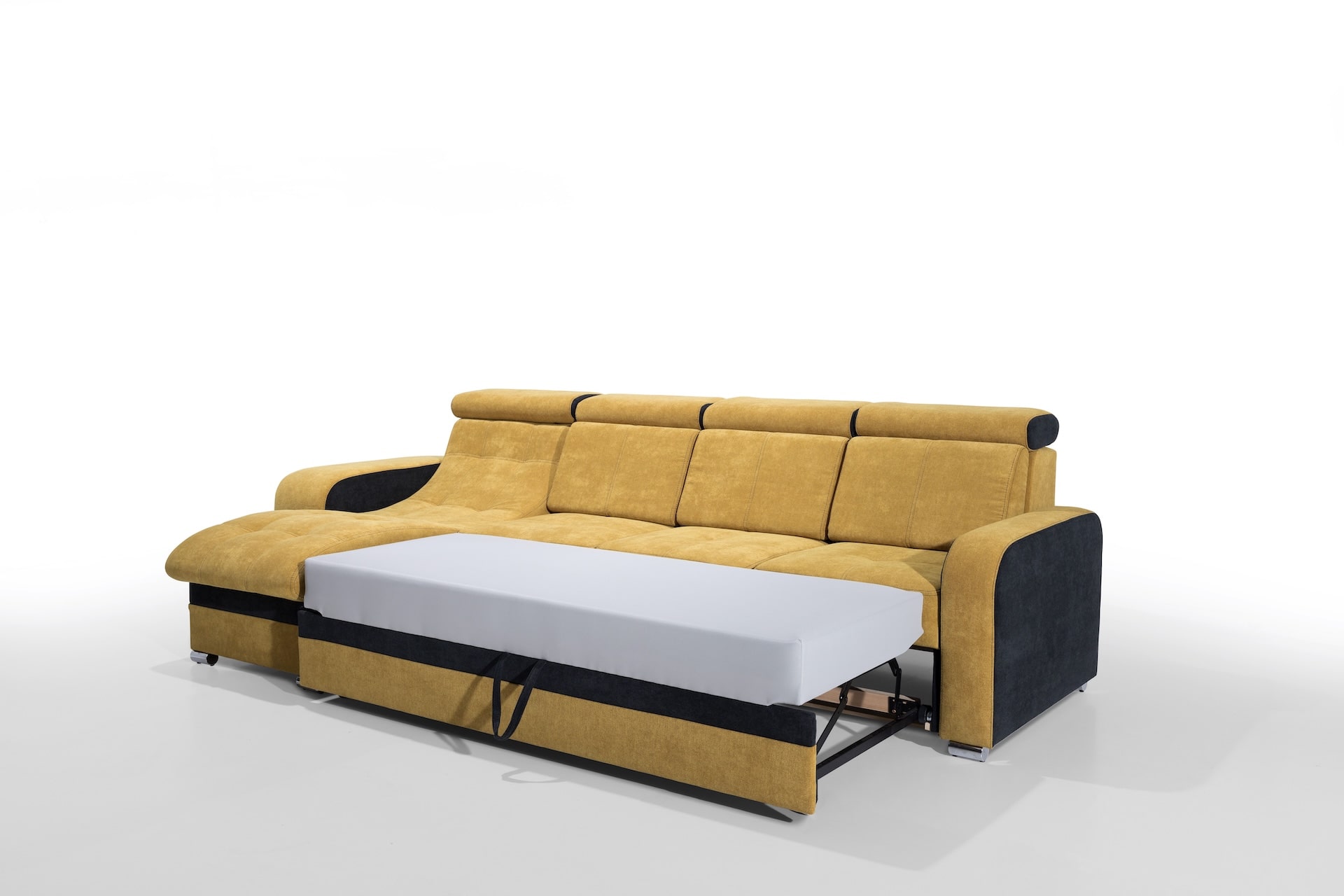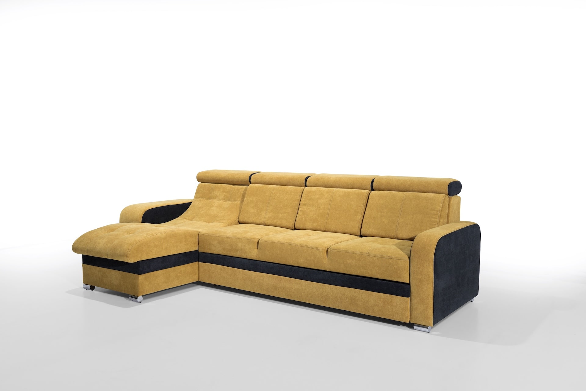 Model został wyposażony w 4 regulowane zagłówki, które umożliwiają indywidualne dopasowanie wysokości oparcia. W zestawie znajdują się również 2 praktyczne pufy, które świetnie sprawdzą się jako dodatkowe siedziska, podnóżki lub element dekoracyjny. Zdejmowane poduchy oparciowe z pianki zapewniają miękkość i komfort podczas użytkowania, a pojemnik na pościel pozwala utrzymać porządek w salonie. Dzięki funkcji rozkładania opartej na mechanizmie DELFIN narożnik szybko zamienia się w wygodną przestrzeń do spania.