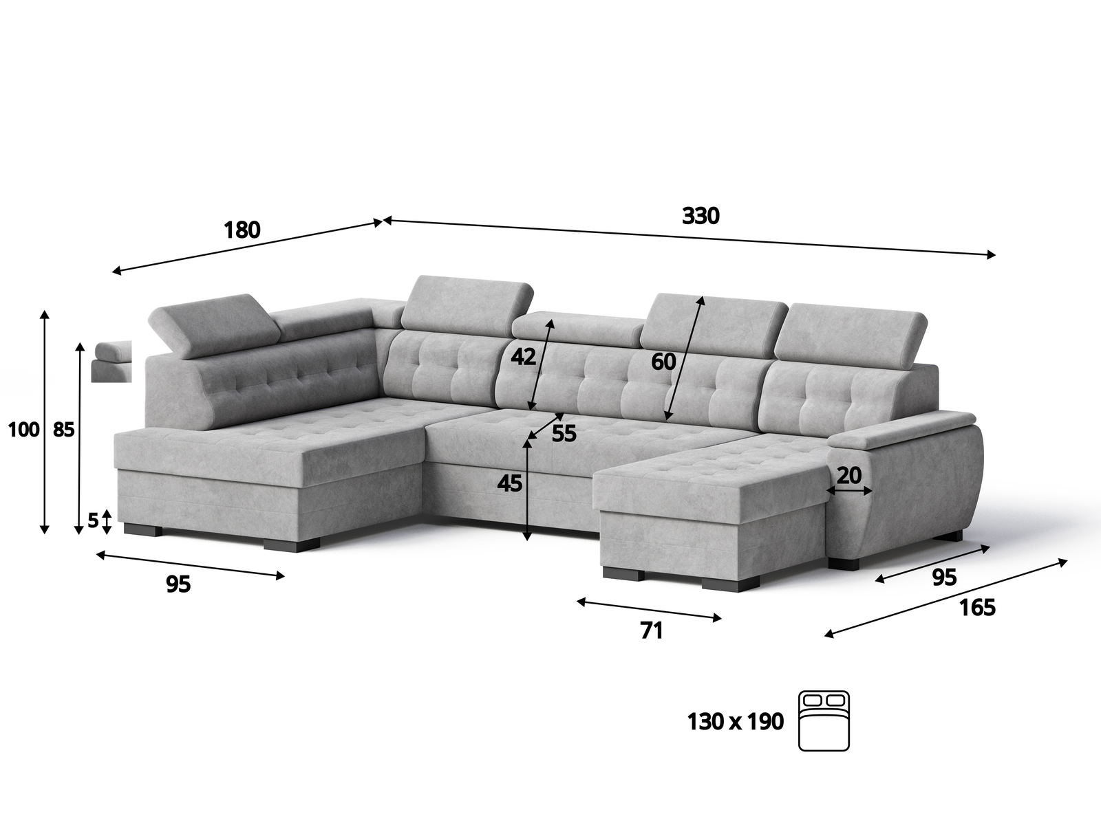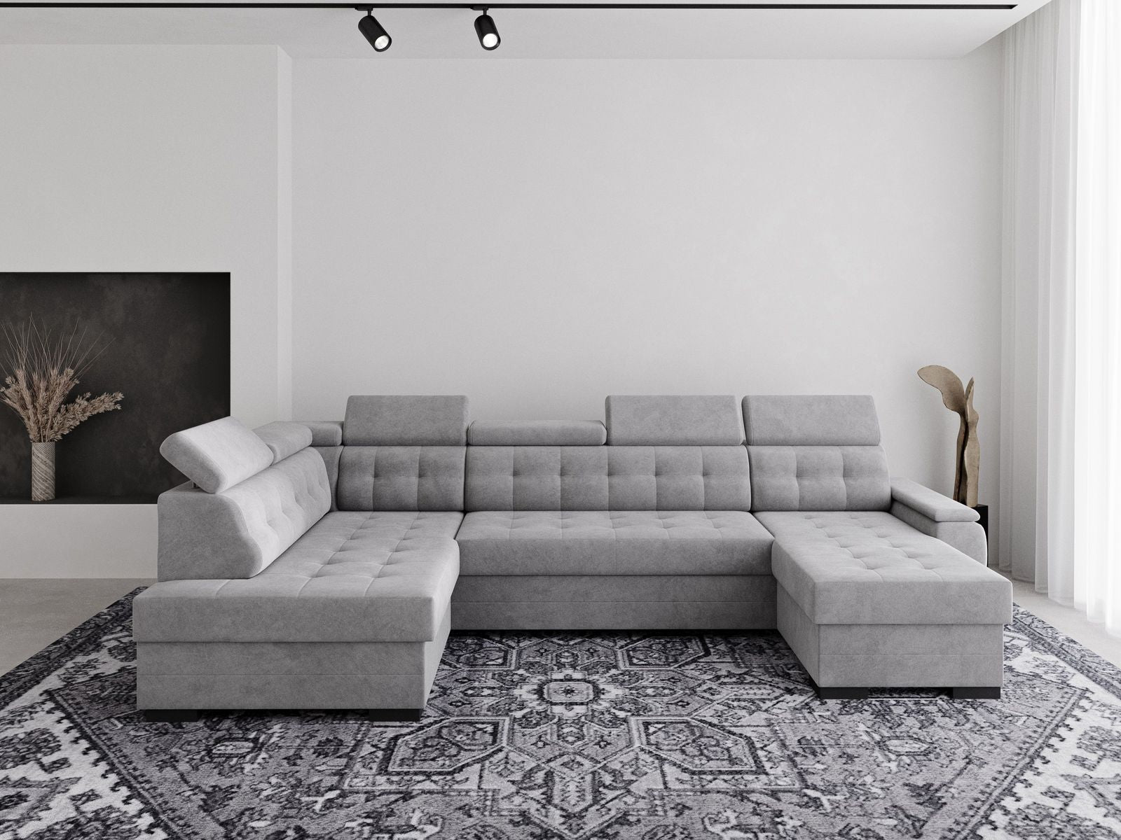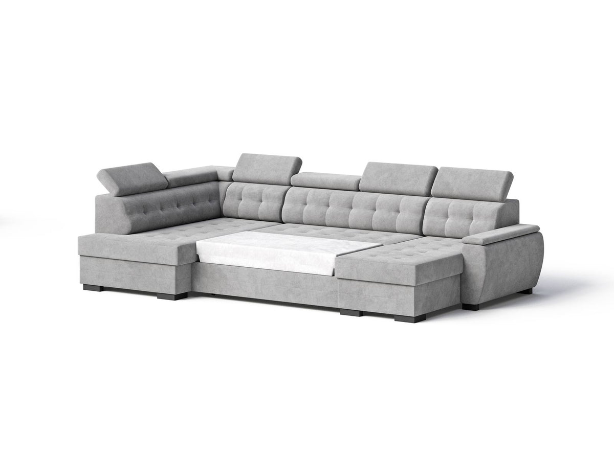 Narożnik Grand U to komfortowy narożnik zaprojektowany z myślą o codziennym wypoczynku. Nowoczesna bryła, regulowane zagłówki oraz funkcja spania zapewniają wygodę zarówno w ciągu dnia, jak i nocą.