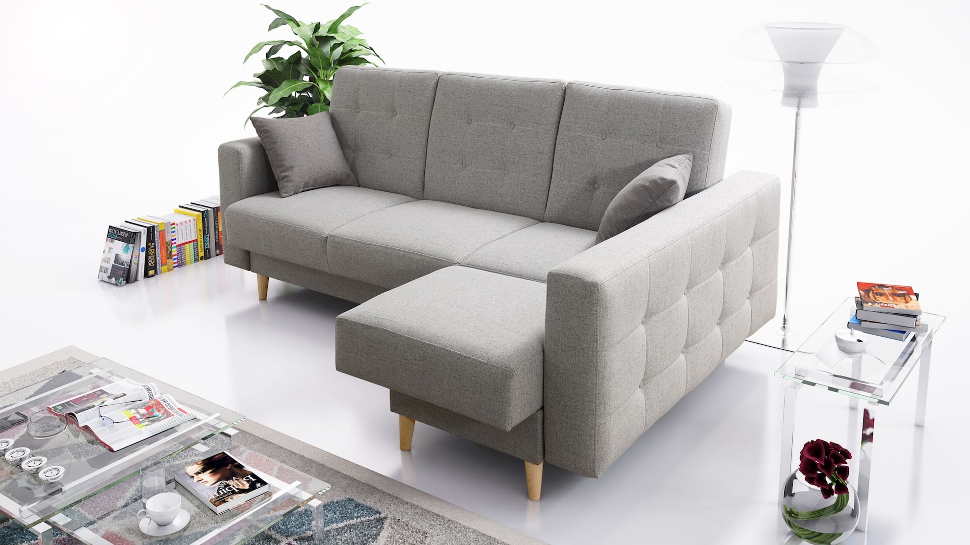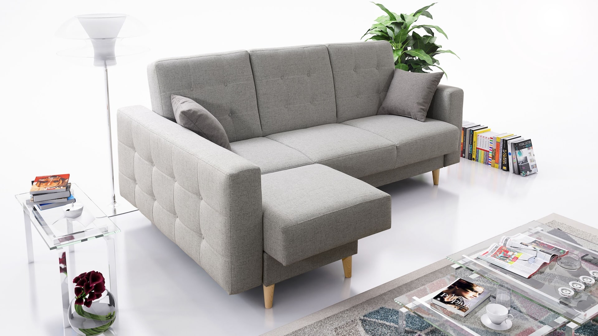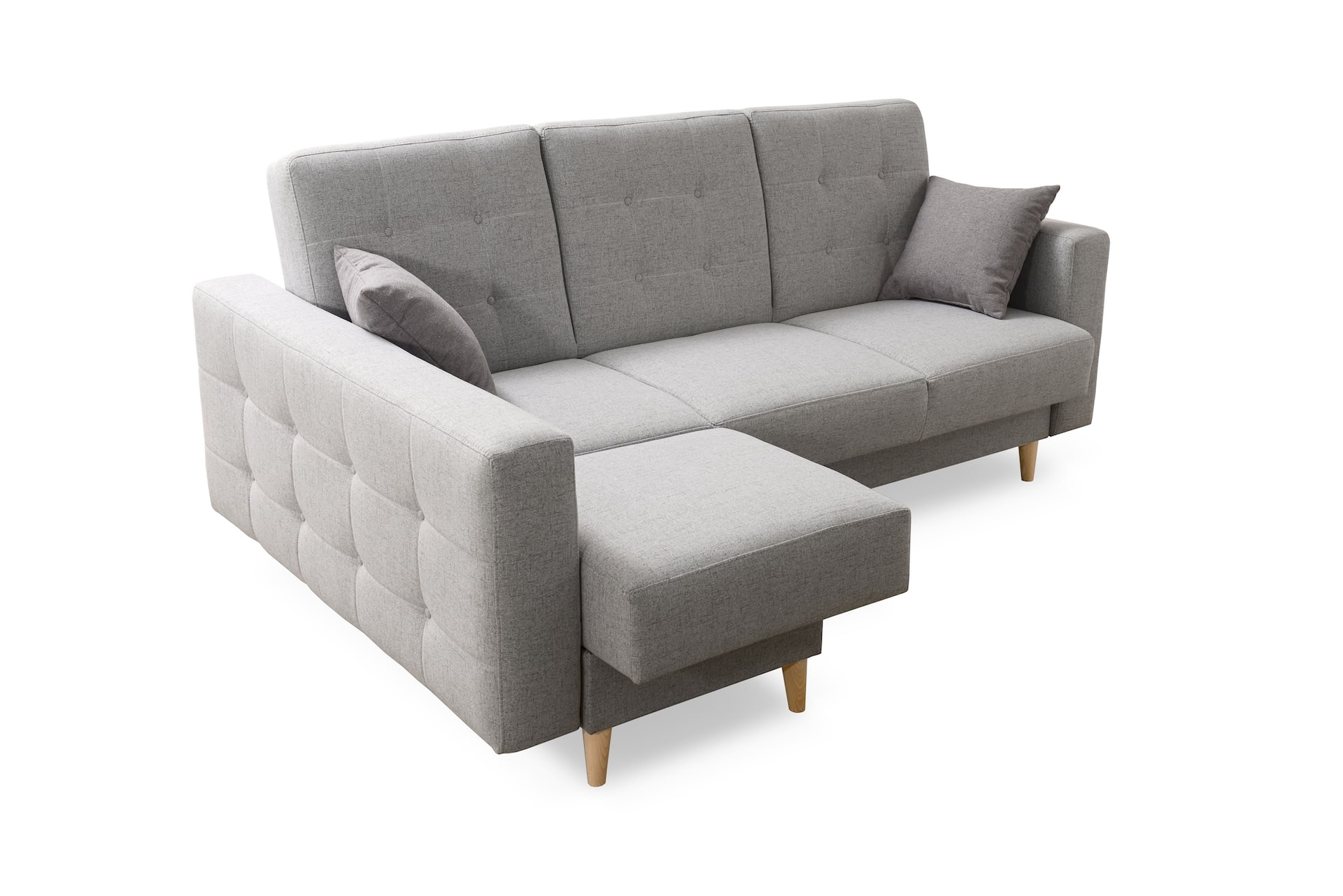 Dzięki funkcji rozkładania opartej na mechanizmie wersalkowym narożnik w prosty sposób zamienia się w komfortową przestrzeń snu. Pojemnik na pościel umożliwia przechowywanie kołder, koców lub poduszek, co ułatwia utrzymanie porządku. W zestawie znajdują się 2 małe poduszki, które zwiększają wygodę użytkowania i pełnią również funkcję dekoracyjną. Możliwość wyboru strony narożnika (lewa/prawa) pozwala idealnie dopasować mebel do układu pomieszczenia.