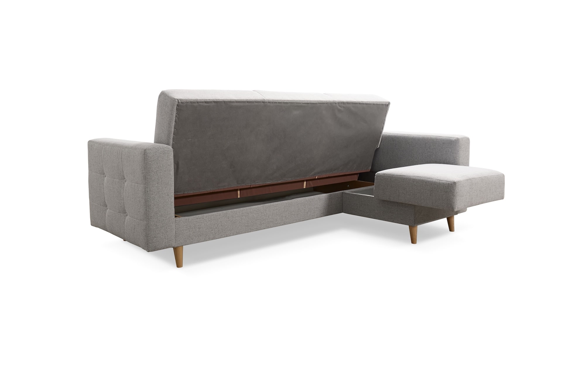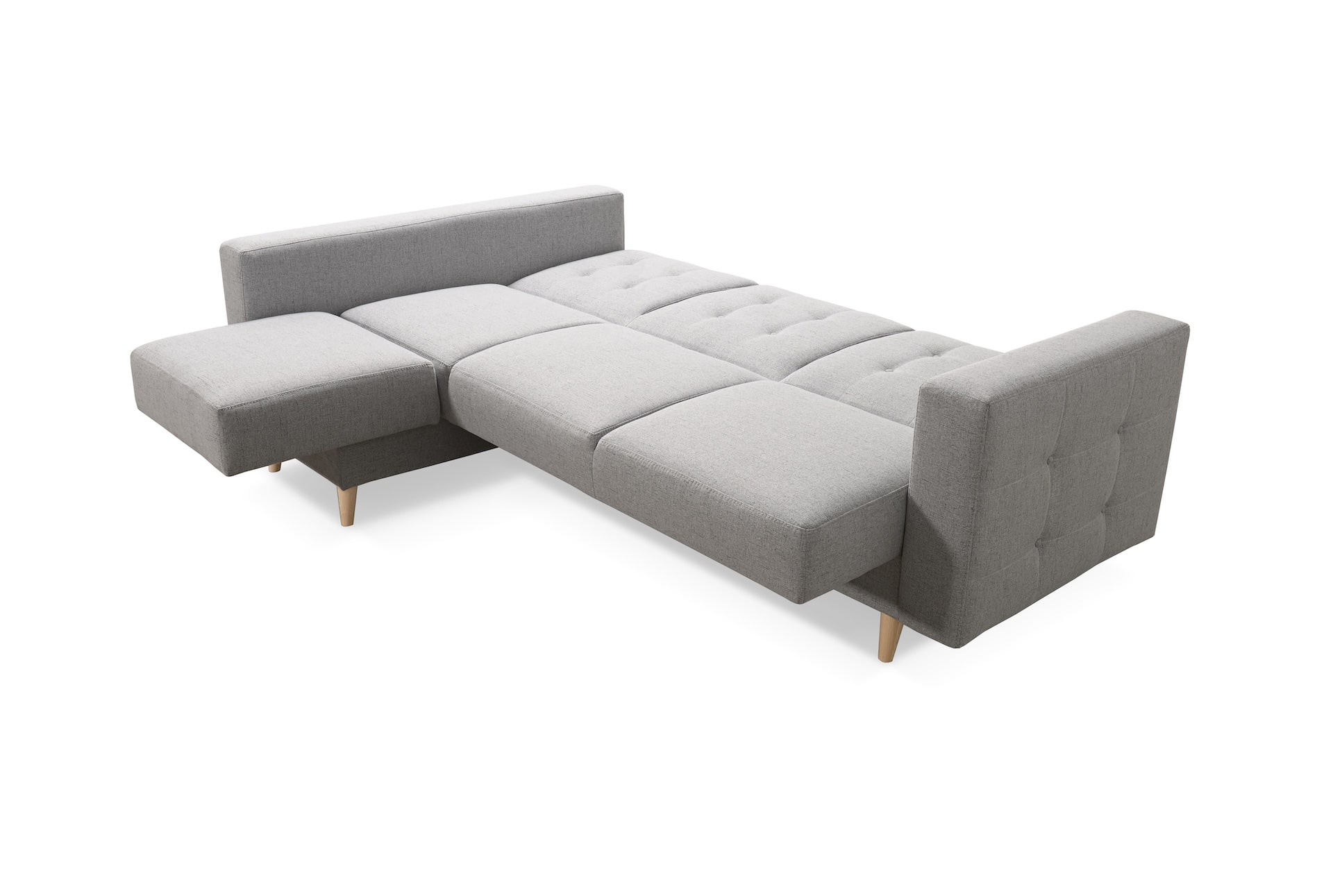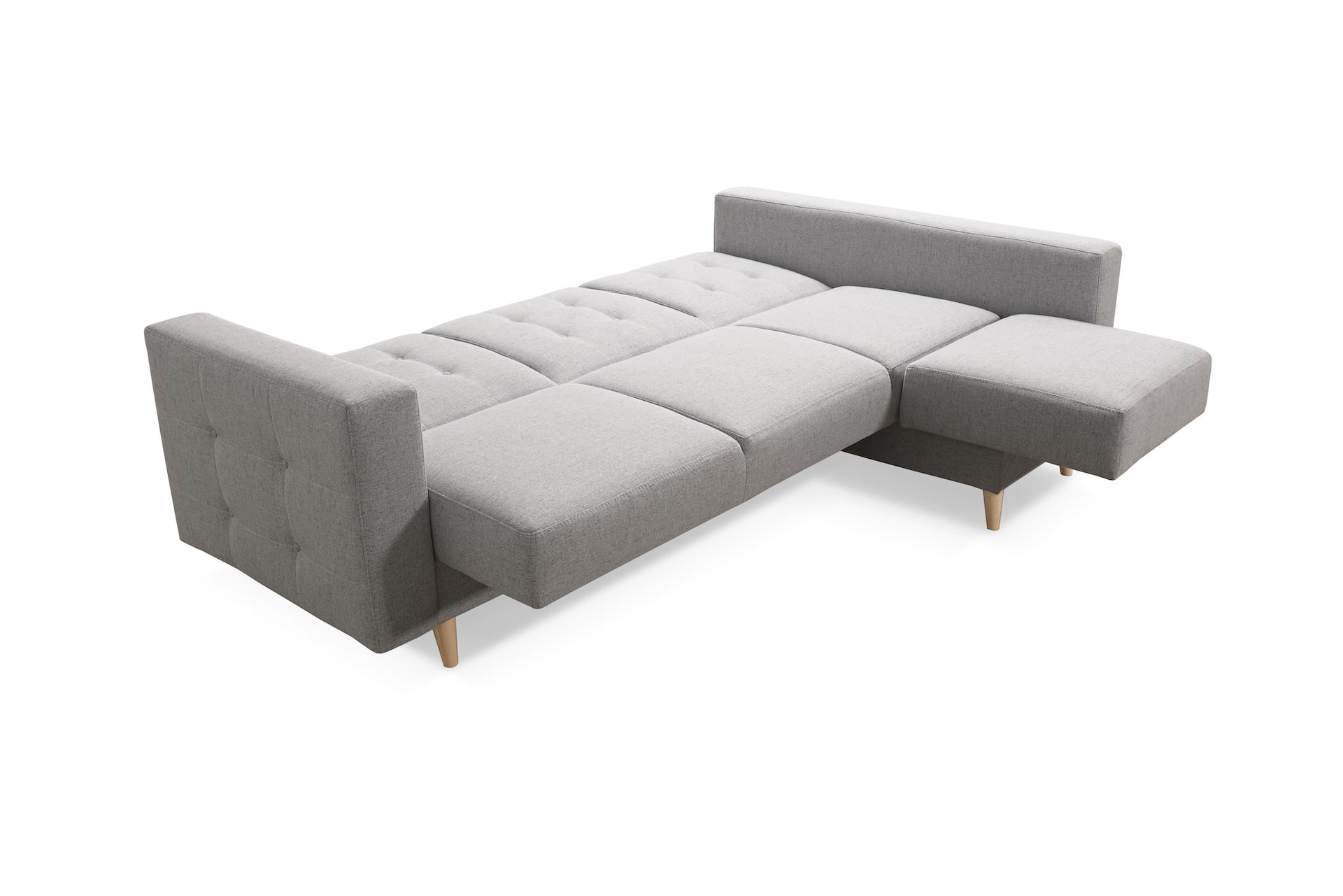 Dzięki funkcji rozkładania opartej na mechanizmie wersalkowym narożnik w prosty sposób zamienia się w komfortową przestrzeń snu. Pojemnik na pościel umożliwia przechowywanie kołder, koców lub poduszek, co ułatwia utrzymanie porządku. W zestawie znajdują się 2 małe poduszki, które zwiększają wygodę użytkowania i pełnią również funkcję dekoracyjną. Możliwość wyboru strony narożnika (lewa/prawa) pozwala idealnie dopasować mebel do układu pomieszczenia.