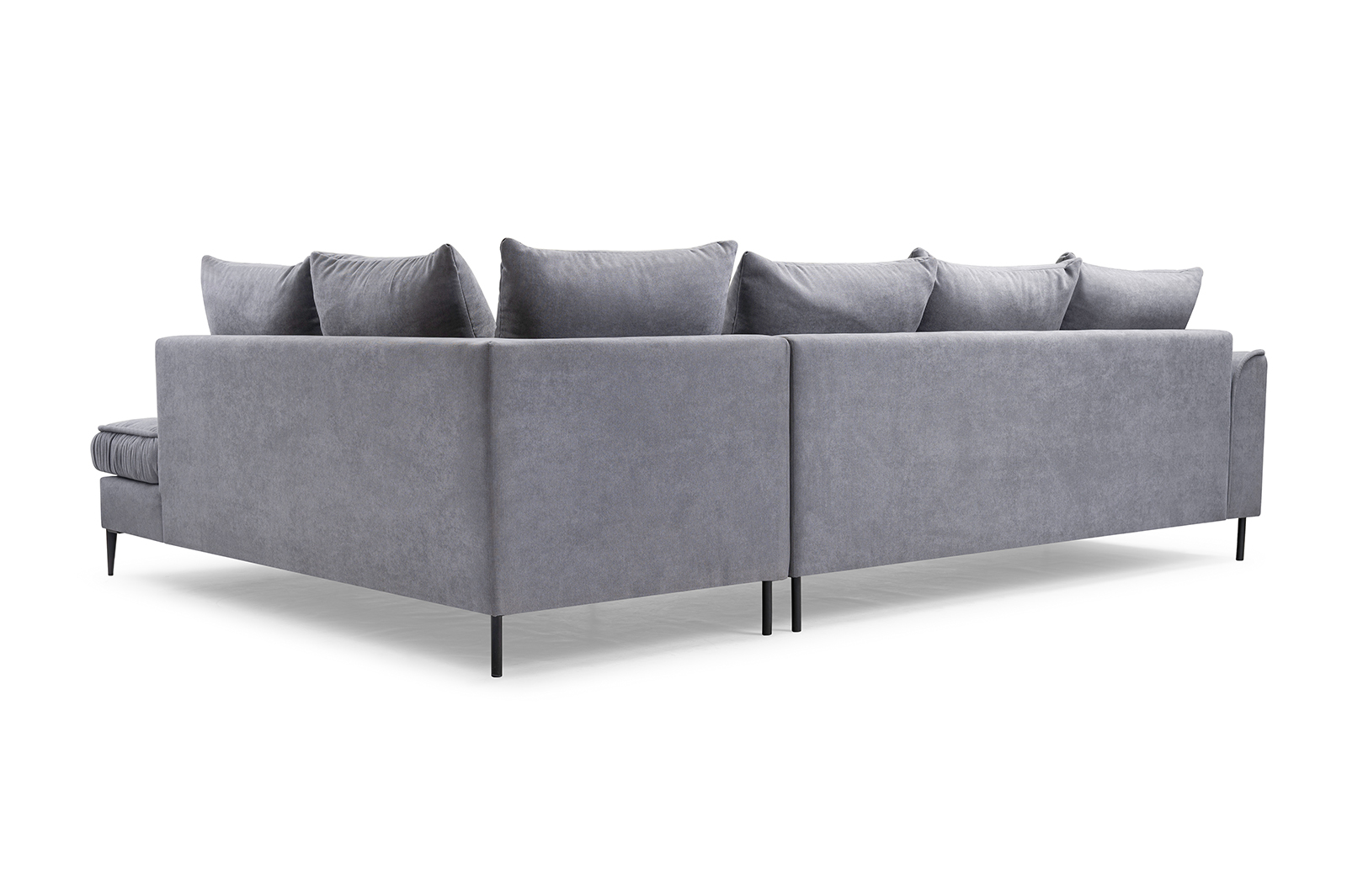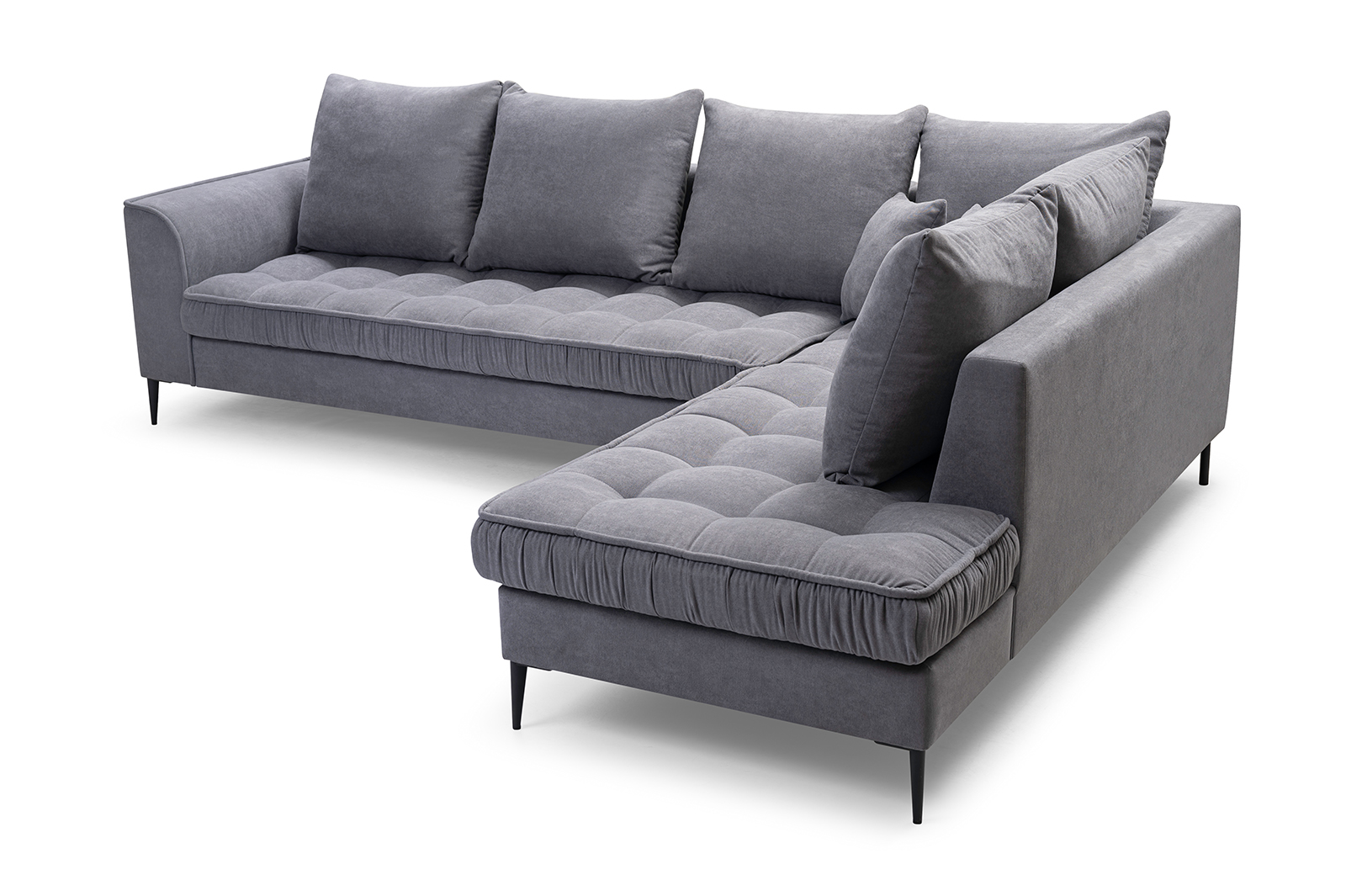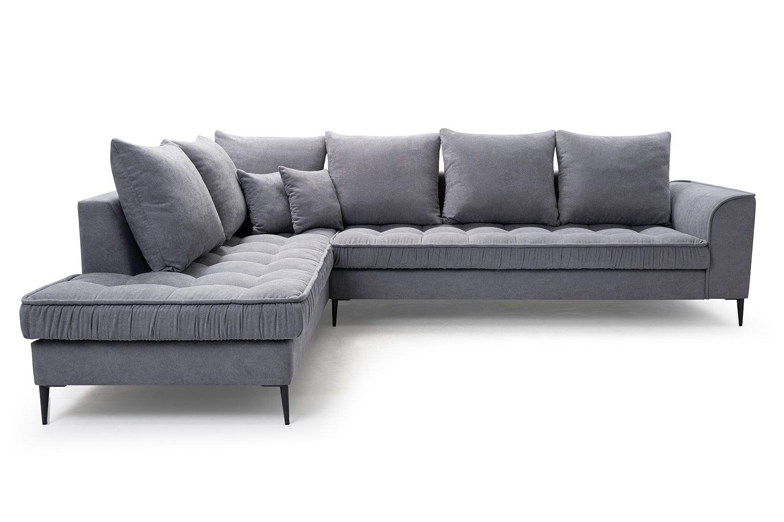 Narożnik Lena to elegancki, nowoczesny mebel tapicerowany, który idealnie sprawdzi się w przestronnym salonie. Charakteryzuje się kształtem litery L i jest dostępny w wersji lewo- lub prawostronnej, co pozwala dopasować go do każdego wnętrza. Dzięki wysokim metalowym nóżkom narożnik zyskuje lekkość wizualną oraz ułatwia utrzymanie porządku pod meblem. Stabilną konstrukcję zapewnia solidny stelaż wykonany z drewna sosnowego, bukowego oraz płyt wiórowych i pilśniowych. Siedzisko wypełnione jest sprężynami falistymi oraz pianką T-30, co gwarantuje wysoki komfort użytkowania, a luźne poduszki oparciowe wypełnione silikonem zapewniają wygodne podparcie pleców i miękkość.