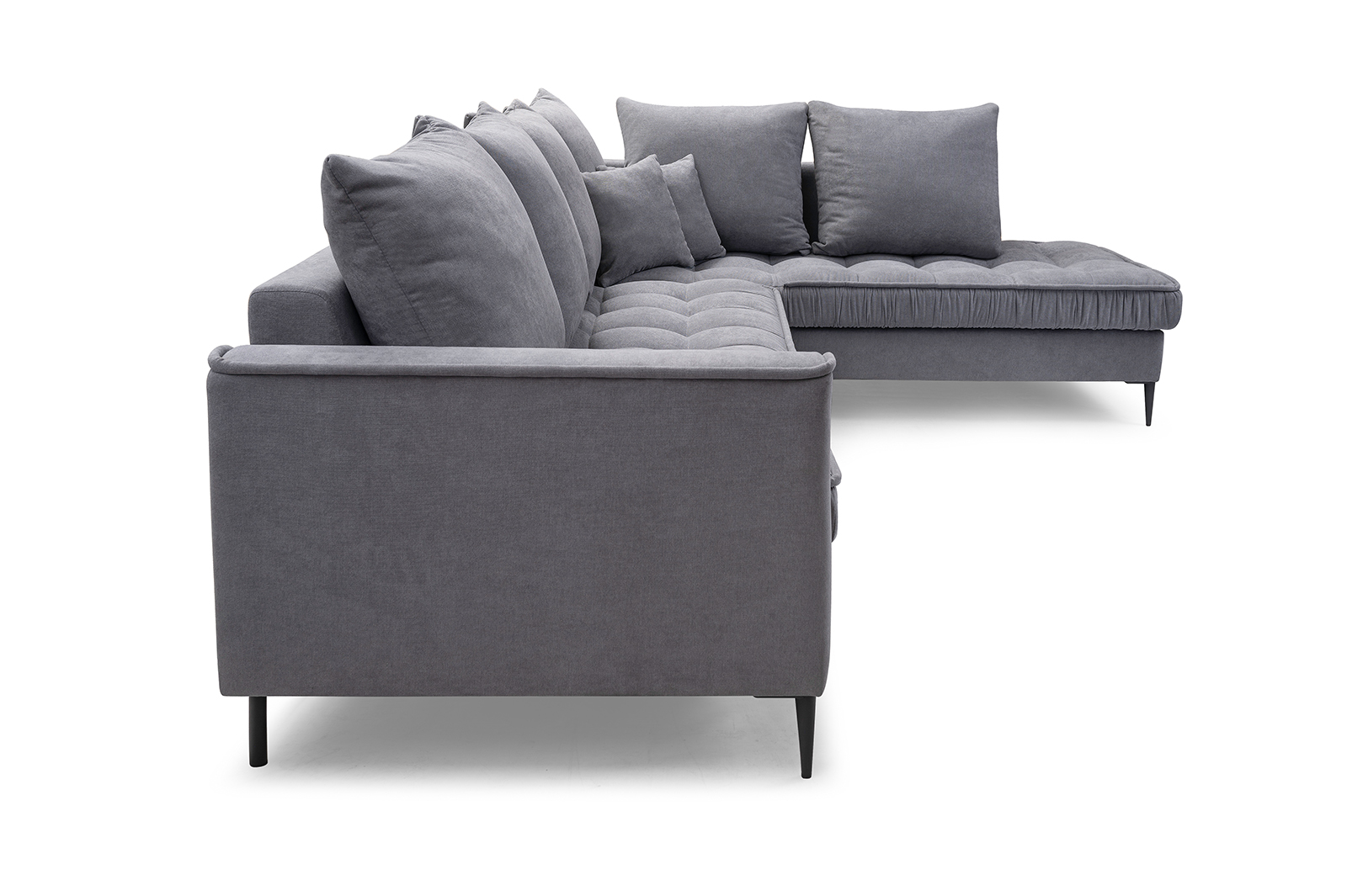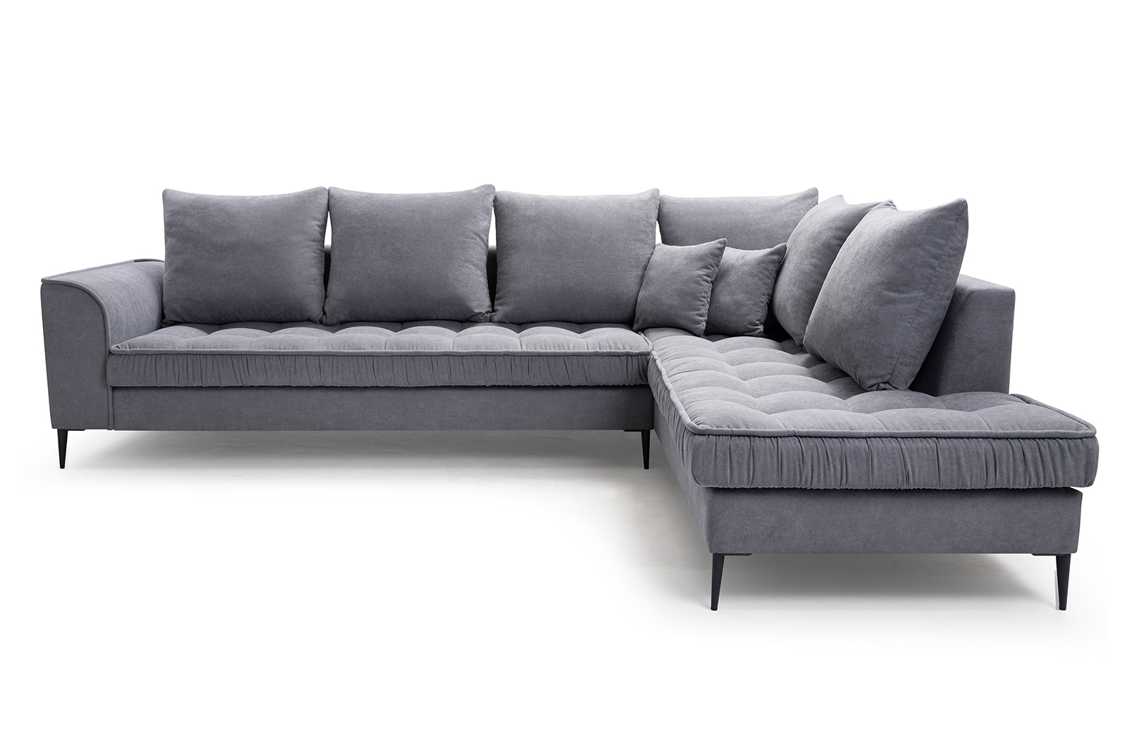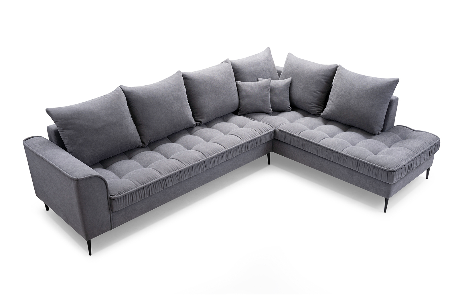 Narożnik Lena to elegancki, nowoczesny mebel tapicerowany, który idealnie sprawdzi się w przestronnym salonie. Charakteryzuje się kształtem litery L i jest dostępny w wersji lewo- lub prawostronnej, co pozwala dopasować go do każdego wnętrza. Dzięki wysokim metalowym nóżkom narożnik zyskuje lekkość wizualną oraz ułatwia utrzymanie porządku pod meblem. Stabilną konstrukcję zapewnia solidny stelaż wykonany z drewna sosnowego, bukowego oraz płyt wiórowych i pilśniowych. Siedzisko wypełnione jest sprężynami falistymi oraz pianką T-30, co gwarantuje wysoki komfort użytkowania, a luźne poduszki oparciowe wypełnione silikonem zapewniają wygodne podparcie pleców i miękkość.