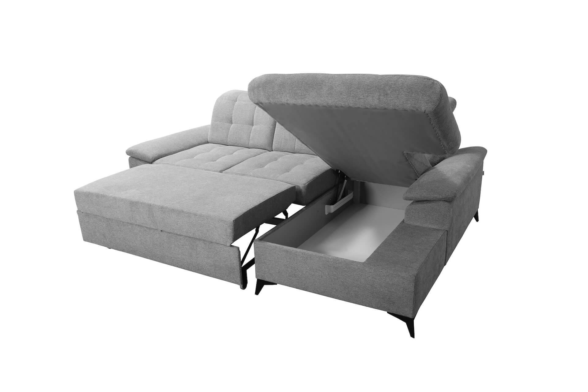Dzięki funkcji rozkładania opartej na mechanizmie DELFIN narożnik łatwo zamienia się w przestronną powierzchnię spania. Komfort zapewnia sprężyna falista oraz pianka wysokoelastyczna, które dbają o sprężystość i stabilne podparcie. Praktyczny pojemnik na pościel umożliwia wygodne przechowywanie kołder czy poduszek, pomagając utrzymać porządek w salonie. NEO MINI to mebel wolnostojący – obity tkaniną z każdej strony, prezentuje się stylowo również ustawiony centralnie.