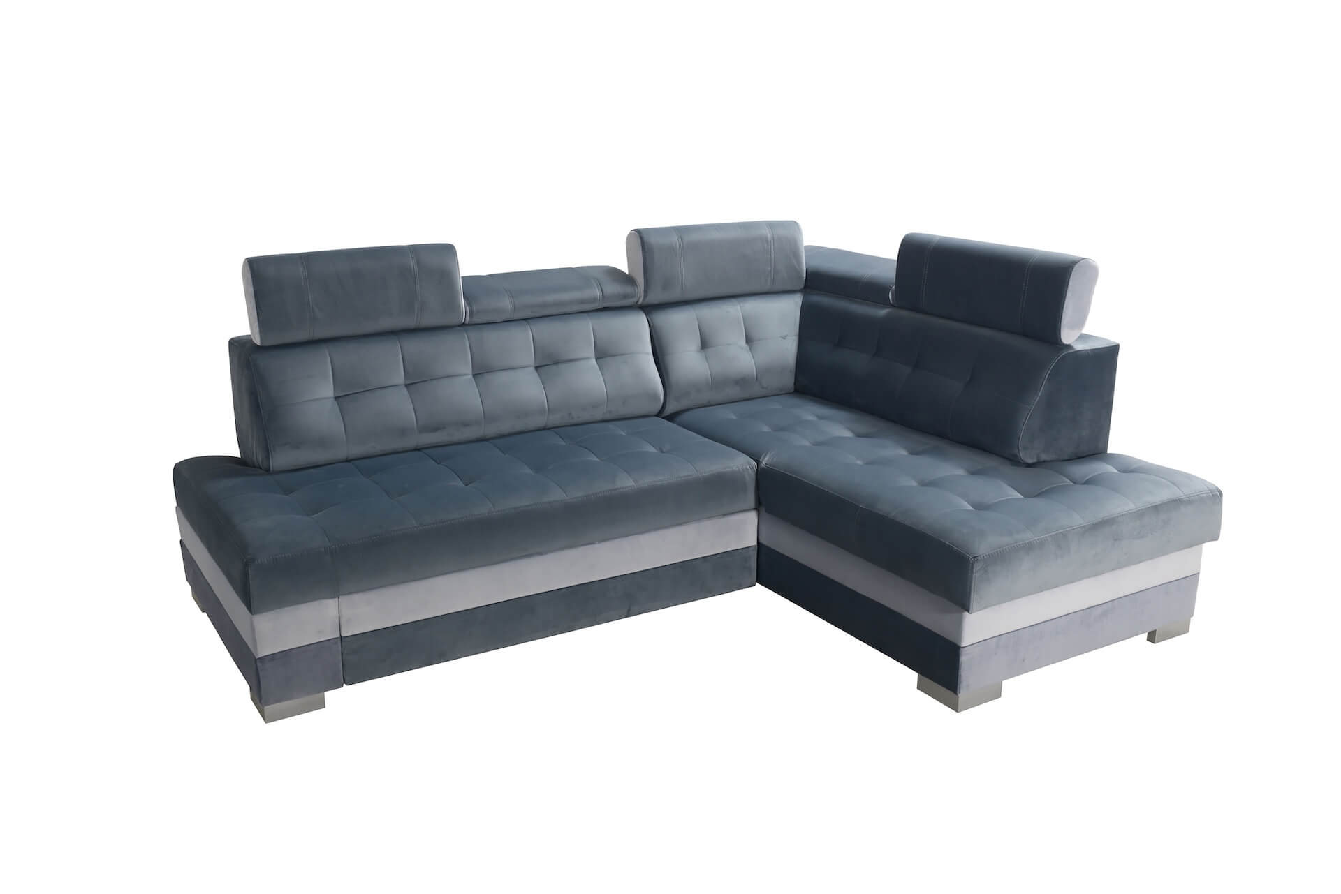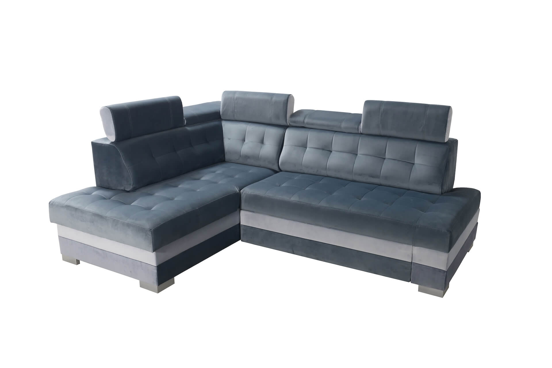 Mebel jest wolnostojący – tył obity tkaniną pozwala ustawić go w centralnej części pomieszczenia bez utraty estetyki. Drewniane nóżki w srebrnym kolorze nadają lekkości i elegancji, podkreślając nowoczesny charakter narożnika. Całość dopełnia tkanina TIFFANY, miękka, welurowa, o subtelnym połysku, który dodaje meblowi ekskluzywnego wyglądu i sprawia, że staje się ozdobą każdego wnętrza.