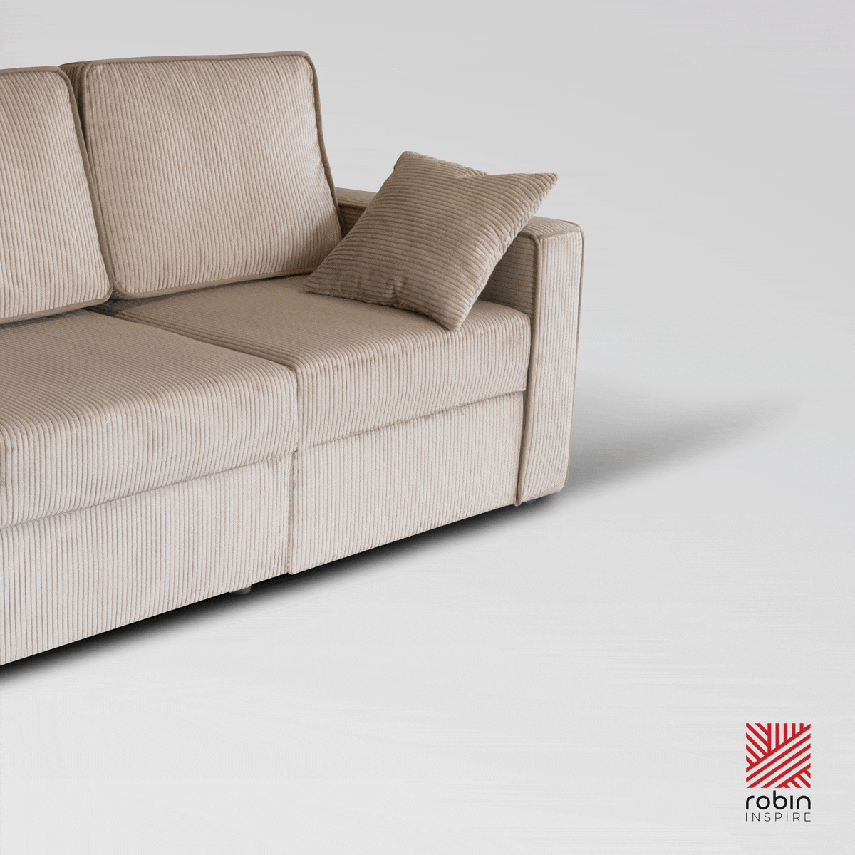 Narożnik PARMA to wyjątkowo funkcjonalny mebel, który łączy w sobie wygodę codziennego użytkowania z nowoczesnym wzornictwem. Jego kompaktowa forma sprawia, że doskonale odnajduje się zarówno w mniejszych, jak i przestronnych salonach, oferując komfort wypoczynku w dwóch wariantach – jako klasyczna kanapa lub pełnowymiarowy narożnik dzięki ukrytej, rozkładanej części. Miękkie poduchy oparciowe oraz dodatkowe małe poduszki zapewniają przyjemne podparcie, tworząc miejsce sprzyjające relaksowi z książką, filmem czy w gronie bliskich.